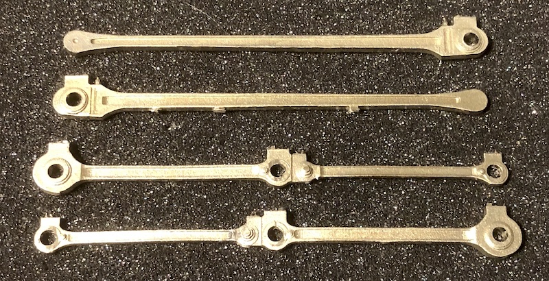 Lieferumfang: Kuppelstangen fertig gebohrt und genietet, Treibstange auf Radseite gebohrt (2. Loch muss je nach vorhandener Niete gebohrt werden, Ankörnung vorhanden)
